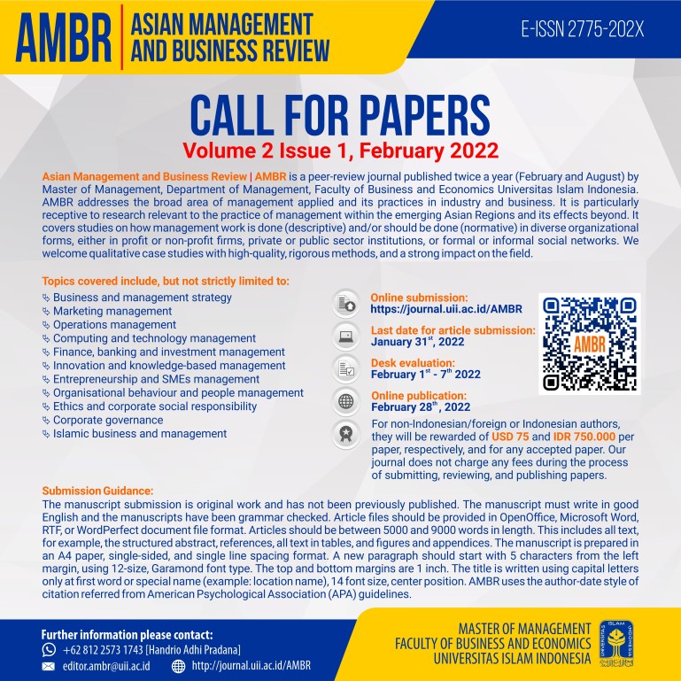 Asian Management and Business Review (AMBR) is a peer-review journal published twice a year (February and August) by the Master of Management, Department of Management, Faculty of Business and Economics Universitas Islam Indonesia. AMBR addresses the broad area of management applied and its practices in industry and business. It is particularly receptive to research relevant to the practice of management within emerging Asian Regions and its effects beyond. It covers studies on how management work is done (descriptive) and/or should be done (normative) in diverse organizational forms, either in profit or non-profit firms, private or public sector institutions, or formal or informal social networks. In addition to positivist/quantitative research, we welcome interpretivist/qualitative case studies, phenomenology, ethnomethodology, or action research with high-quality, rigorous methods, and a strong impact on the field.