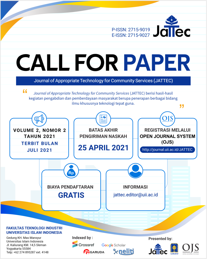 Journal of Appropriate Technology for Community Services (JATTEC) berisi hasil-hasil kegiatan pengabdian dan pemberdayaan masyarakat berupa penerapan berbagai bidang ilmu khususnya teknologi tepat guna. Jurnal ini sebagai wadah untuk mempublikasikan pengembangan teknologi yang digunakan dalam pengembangan dan pemberdayaan masyarakat. Pengembangan dan pemberdayaan masyarakat dilakukan melalui peningkatan UMKM, usaha perekonomian, maupun kegiatan lainnya yang meningkatkan kualitas pengetahuan dan kemampuan masyarakat. Sehingga diharapkan pula dalam penerbitan jurnal ini dapat memberikan manfaat dan tambahan informasi kepada pihak ketiga yang membaca jurnal ini.