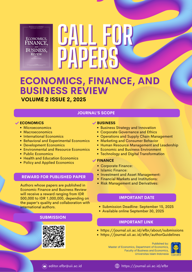 Economics, Finance, and Business Review is a peer-reviewed journal published by the Master of Economics, Department of Economics, Faculty of Business and Economics, Universitas Islam Indonesia. This journal publishes the results of scientific works on Economics, Finance, and Business. The specific fields for the Economics category are Monetary Economics, Development Economics, Public Economics, Regional Economics, International Economics, and Islamic Economics. The fields for the Finance category are Corporate Finance, Banking, Investment and Asset Management, Financial Markets and Institutions, Behavioural Finance, and Islamic Finance. The specific fields for the Business are Business Strategy and Innovation, Corporate Governance, Human Resource Management, Marketing and Consumer Behavior.