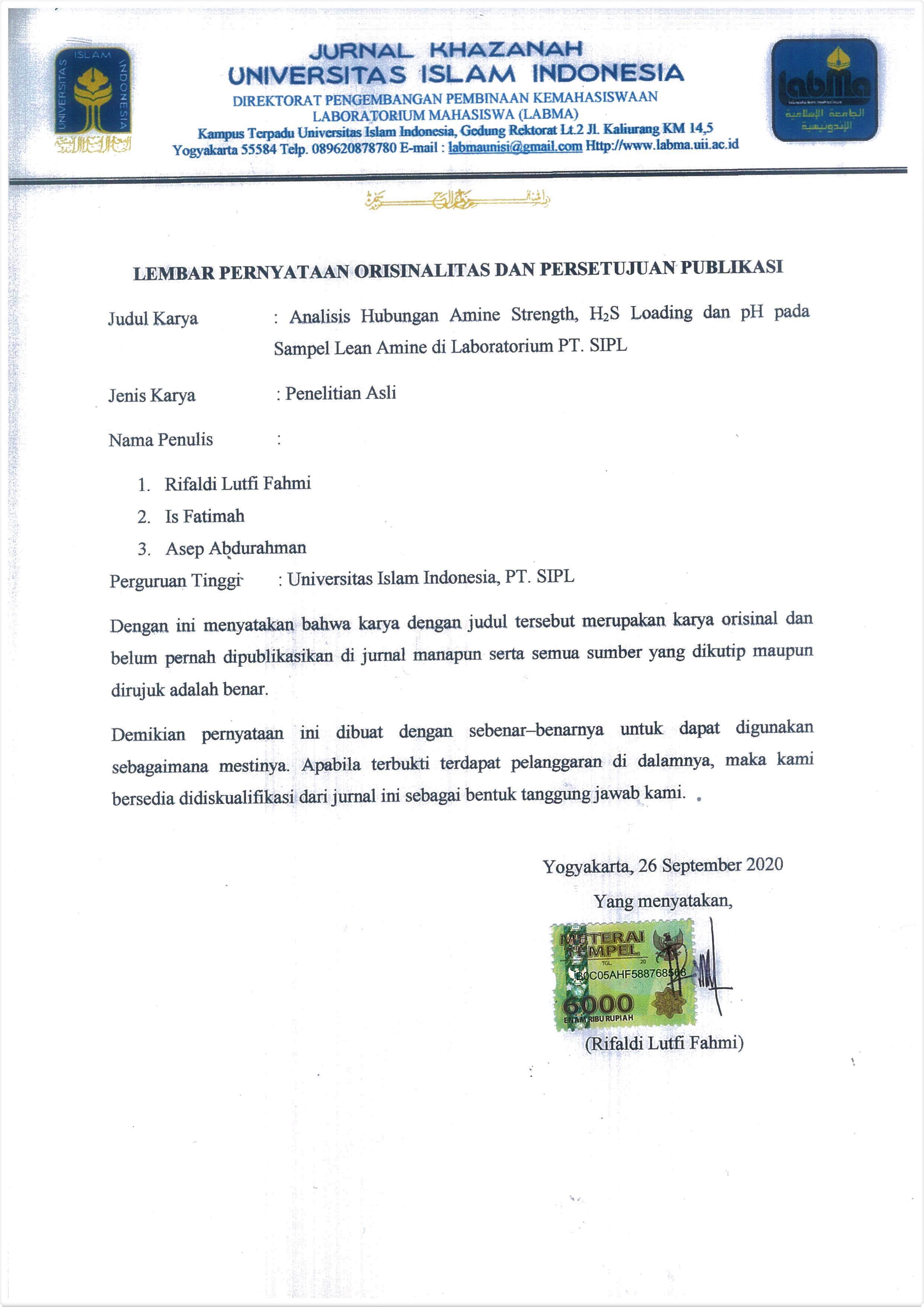 Bahan bakar merupakan hal essensial dalam kehidupan manusia, salah satunya adalah gas alam. Gas alam banyak digunakan di berbagai sektor seperti industri, transportasi, dan rumah tangga. Gas alam diperoleh dari proses pengeboran minyak bumi. Gas alam yang diperoleh masih mengandung gas-gas seperti karbondioksida CO2) dan hidrogen sulfida (H2S) yang perlu dihilangkan karena dapat menyebabkan korosi pipa bahkan memicu terjadinya ledakan. Hasil pembakarannya pun berbahaya bagi manusia dan lingkungan. Oleh karena itu penelitian ini dilakukan untuk menentukan nilai amine strength dan H2S loading serta hubungannya dengan pH sampel lean amine. Analisis nilai amine strength dan H2S loading dilakukan terhadap sampel lean amine, yaitu sampel yang berasal dari amine regenerator system di PT. SIPL. Penentuan nilai amine strength dilakukan dengan titrasi asidimetri dengan larutan HCl 0,5 N sebagai titran menggunakan autotitrator. Penentuan nilai H2S loading dilakukan dengan titrasi iodometri menggunakan larutan standar Na2S2O3 0,1 N. Nilai amine strength yang diperoleh dari hasil analisis selama 7 hari adalah 33,620%; 34,295%; 34,725%; 35,139%; 35,583%; 36,464% dan 36,683%. Nilai H2S loading yang diperoleh dari hasil analisis selama 7 hari yaitu, 0,0587; 0,0376; 0,0372; 0,0500; 0,0356; 0,0367 dan 0,0359 mol/mol. Semakin tinggi nilai pH sampel semakin rendah nilai H2S loading. Nilai H2S loading yang diperoleh masih dalam batas aman yang ditentukan oleh US EPA yaitu 16 ppm.