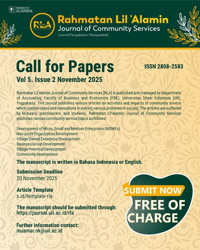 Rahmatan Lil’alamin Journal of Community Services [RLA] is published by the Department of Accounting, Faculty of Business and Economics, Universitas Islam Indonesia. The journal is published two times each year in May and November. This journal publishes various articles on activities and impacts of community service which contain ideas and innovations in solving various problems in society.